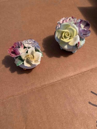 This is a pair of vintage decorative bone china floral arrangements, likely of English origin such as Royal Doulton or Aynsley. The ornaments feature intricately hand-modeled ceramic flowers including roses, carnations, and pansies. The color palette is composed of soft pastels, featuring shades of buttery yellow, lavender, pale pink, and deep magenta, accented by hand-painted green leaves. The larger piece is approximately 3-4 inches wide, while the smaller measures around 2 inches. They are constructed with delicate, thin-walled petals characteristic of high-quality bone china. Each arrangement is set into a small, footed white porcelain base with a scalloped or fluted edge. Notable features include the realistic curling of the rose petals and the fine stippling on the pansy centers. In terms of condition, these items are highly susceptible to damage; visible inspection suggests some minor 'flea bite' chipping on the extremely thin edges of the petals, which is common for this type of ware. No maker's marks are visible from this angle, but they typically feature a backstamp on the underside of the base. These pieces appear to date from the mid-20th century (circa 1950s-1970s). The craftsmanship illustrates a high level of technical skill in ceramic modeling, requiring significant hand-to-eye coordination for the assembly of such fragile components.