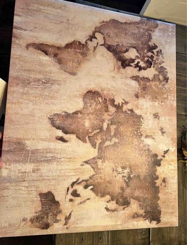This item is a rectangular, landscape-oriented piece of wall art featuring an abstract representation of a world map. The artwork is executed in a monochromatic, sepia-toned palette, utilizing various shades of brown, tan, and cream to create a distressed, vintage aesthetic. The map's continents are rendered in dark brown with textured, mottled edges that suggest a stenciled or printed application rather than hand-painting. This weathered look is further enhanced by artificial 'scratch' marks and faux-ageing across the cream-colored background, imitating the appearance of old parchment or an antique textile. The piece appears to be a modern giclée print on gallery-wrapped canvas, as evidenced by the visible tautness across the frame and the lack of an external bezel. There are no visible maker's marks, signatures, or dates on the front surface. The condition appears to be fair to good, though there is a noticeable vertical crease or line visible on the left side of the canvas, which may indicate a substrate defect or a manufacturing error during the wrapping process. This style of décor is typical of the early 21st-century industrial or 'modern farmhouse' design period, intended for mass-market home decoration.