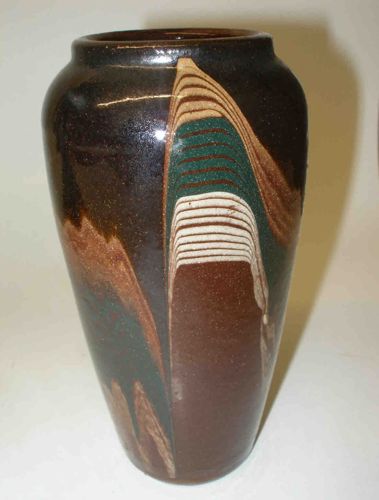 This item is a hand-thrown studio pottery vase, likely mid-to-late 20th century, displaying a tapered ovoid form with a slightly recessed rim. The vessel is constructed from dense stoneware and finished with a dark, chocolate-brown tenmoku-style base glaze that exhibits a subtle crystalline shimmer and fine pitting characteristic of high-fire reduction. The primary decorative feature is a series of 'poured' or 'dipped' abstract motifs in earthy tones of rust, cream, and forest green. Notably, the central design utilizes a sgraffito-like combed technique or systematic wax resist to create horizontal banded lines within the teardrop shape, suggesting high-level technical skill. The glaze shows a vibrant, glossy finish with natural variations in thickness that create depth. No immediate cracks or chips are visible from the exterior, and the piece maintains a robust, utilitarian weight. The style is reminiscent of Modernist or Arts and Crafts studio movements, reflecting professional craftsmanship without visible maker's marks from this angle. The interior appears to be glazed to match the exterior rim, ensuring functional integrity for holding water.