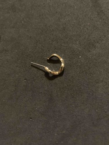 This item is a single C-hoop style earring featuring a contemporary organic design. The earring is constructed from a gold-toned metal with a visible hammered texture across the outer surface, creating a wavy, undulating profile. It measures approximately 15mm to 20mm in diameter. The piece is equipped with a straight post backing for pierced ears, though the friction butterfly clutch or backing is missing. The metal exhibits a warm, lustrous golden finish, but there is noticeable tarnishing and discoloration where the post joins the main hoop, suggesting a base metal like brass or copper with gold plating rather than solid gold. The post itself appears to be made of a different, silver-toned surgical steel or alloy to prevent skin irritation. There are no visible maker's marks, hallmarks, or purity stamps discernible in the provided image. The overall condition shows moderate wear and surface scuffing consistent with frequent use. The style is indicative of modern mass-market fashion jewelry from the late 20th or early 21st century, focusing on minimalist, handcrafted-look aesthetics.