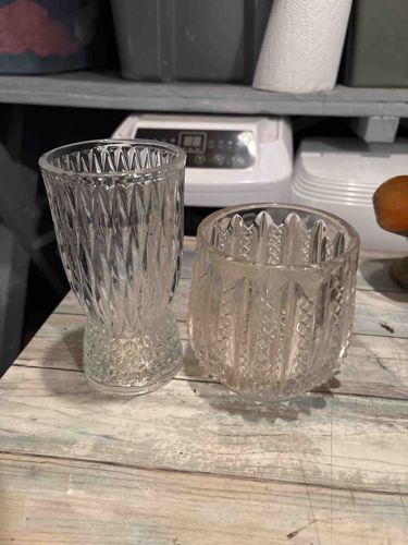 This set consists of two distinct vintage pressed clear glass vessels, likely dating from the mid-20th century. The taller piece on the left features a flared rim with a tapering body adorned with deep-cut diamond or harlequin patterns that catch the light efficiently. It sits upon a stout, textured pedestal base with a starburst or cross-hatched motif. The second piece, positioned to the right, is a shorter, more bulbous 'celery' or 'spooner' style vase. It exhibits vertical fluting combined with intricate hobnail or cross-cut diamond bands near the center and base. Both items are constructed from thick, transparent glass, characteristic of mass-produced decorative glassware from several American manufacturers such as Anchor Hocking or Indiana Glass. The craftsmanship shows typical mold lines indicative of the pressing process. Physically, the items appear in good vintage condition with no large chips or cracks visible in the image, though close inspection might reveal minor surface scratches or 'flea bites' consistent with age and use. There are no visible maker's marks or signatures apparent from this angle. The style is reminiscent of the EAPG (Early American Pattern Glass) revival period, designed for functional home utility or as affordable decorative accents.