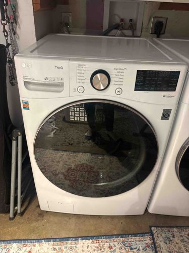 This is a contemporary LG ThinQ front-loading washing machine, featuring a standard white enamel finish on a metal chassis. The unit is equipped with an Inverter Direct Drive motor system, as indicated by the prominent branding on the upper left detergent drawer. Centrally located on the control panel is a large, metallic-finish cycle selection dial surrounded by various wash settings including 'Normal', 'Heavy Duty', 'Bedding', and 'Delicate'. To the right, a digital touch-control interface with a dark LED display screen provides specific cycle adjustments for temperature, spin speed, and soil level. The machine features a large circular glass door with a dark tinted trim, allowing visibility into the stainless steel drum. Notable markings include the 'ThinQ' logo signifying smart-home connectivity and a '10-year warranty' badge on the right side of the door. The appliance appears to be a modern model, likely manufactured within the last 5 years. Condition-wise, the unit shows light household wear; several colorful stickers or labels are visible on the left side of the front panel, and there is some minor surface dust and localized smudging on the glass door and control interface. No significant structural damage, rust, or deep scratching is immediately apparent in the provided image.