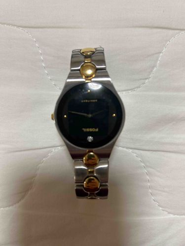 This is a Fossil brand analog wristwatch featuring a distinctive two-toned stainless steel aesthetic. The watch is designed with a round, polished silver-tone case that seamlessly integrates into a broad-shouldered bracelet. The dial is a minimalist black sunray or gloss finish, accented by the 'FOSSIL' logo, slender gold-toned baton hands, and a single crystalline accent (likely a small diamond or crystal) located at the 6 o'clock position. The bracelet is constructed of brushed silver-tone links highlighted by polished gold-tone circular or 'dot' center links, creating a decorative, jewelry-like appearance. The construction appears to be a quartz movement protected by a mineral crystal lens. Regarding condition, the metal surfaces show micro-scratches and light wear consistent with regular use, particularly on the gold plating which may show thinning on high-friction areas. The watch likely dates to the late 1990s or early 2000s, reflecting the era's preference for sleek, integrated sports-luxe designs. The overall craftsmanship is consistent with Fossil's mass-market fashion line, prioritizing style and brand recognition.