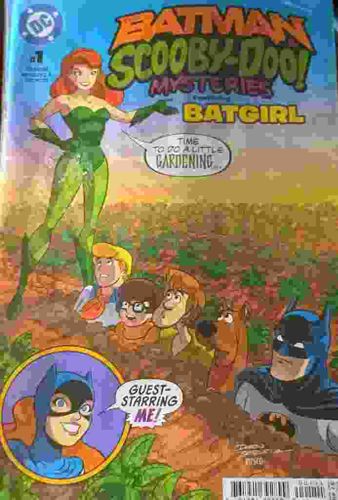 This is a modern age comic book titled 'The Batman & Scooby-Doo Mysteries' issue #1, published by DC Comics in 2021. The cover art features a crossover event including Batman, the Scooby-Doo gang (Fred, Velma, Shaggy, and Scooby), and Poison Ivy, who is depicted as a giantess overlooking an agricultural field with the speech bubble 'Time to do a little gardening...'. A lower-left circular inset features Batgirl with the text 'Guest-Starring Me!'. The comic follows the standard American comic format of approximately 6.6 x 10.2 inches. The cover art is rendered in a clean, animated television style consistent with 'The Batman Adventures' and 'Scooby-Doo' cartoons. Notable markings include the DC logo and issue number at the top left and a modern barcode at the bottom right. The condition appears to be moderately used based on the digital image; visible signs of wear include soft corners, slight color breaks along the spine, and minor creasing on the right-hand edge. The registration and printing colors remain vibrant, indicating a high-quality modern offset printing process. This issue is significant for continuing the tradition of DC’s team-up books aimed at younger audiences.