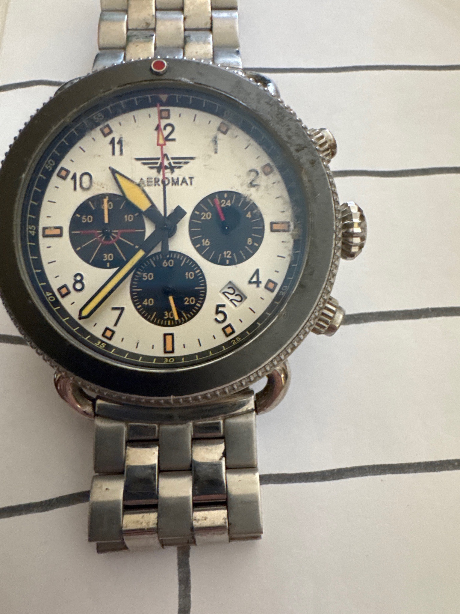This is an Aeromat brand pilot-style chronograph wristwatch featuring a distinctive 'Panda' dial configuration (a light cream or silver-white primary dial with three contrasting dark sub-dials). The watch is housed in a circular stainless steel case with a coin-edge bezel featuring a red marker at the 12 o'clock position. The dial displays bold Arabic numerals and features a prominent winged logo under the 12 o'clock marker. The handset includes a yellow-tipped hour and minute hand and a thin red-tipped second hand. Functional elements on the right side of the case include a large fluted crown flanked by two smaller chronograph pushers. The watch is presented on a multi-link stainless steel engineer-style bracelet. Visible condition issues include significant surface grime, oxidation or dirt accumulation between the bezel and the crystal, and heavy scratching on the lugs and bracelet links, suggesting frequent wear without recent cleaning. A date window is positioned between the 4 and 5 o'clock markers, showing number 22. Based on the styling and brand, this is likely a contemporary piece designed with mid-20th-century aviation aesthetics in mind, utilizing a quartz or modern mechanical movement.