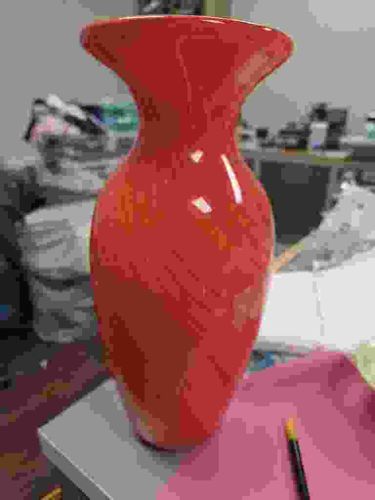 This is a medium-sized decorative glass vase characterized by its vibrant, solid red coloration and high-gloss finish. The vessel features a classic amphora-inspired silhouette with a slender, tapered base that widens into a bulbous body before constricting at the neck and flaring out into a graceful trumpet-shaped rim. The material appears to be cased or pigmented glass, showing a consistent saturated red hue throughout the exterior surface. Reflections on the surface indicate a smooth, highly polished glaze without immediate evidence of texture or etching. While specific maker's marks or signatures are not visible from the frontal perspective, the symmetry and uniform finish suggest a contemporary mass-produced or studio-glass origin, likely dating from the late 20th to early 21st century. The condition appears to be good with no structural cracks or significant chips visible, although minor surface scratches typical of shelf wear may be present upon closer inspection. The construction shows a seamless flow from the rim to the base, indicating quality heat-molding or glass-blowing techniques. Its minimalist aesthetic aligns with modern interior design styles.