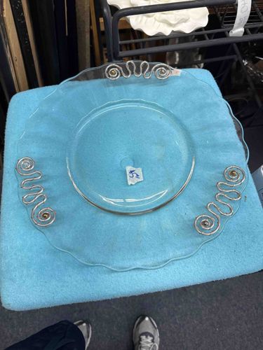 This is a large, circular clear glass serving platter featuring a distinctive scalloped or crimped edge. The platter is constructed from heavy, translucent glass with a flat central well and wide, upward-sloping rim. A notable design feature includes three decorative silver-tone metal wire overlays positioned symmetrically around the perimeter. These wire accents are shaped in a rhythmic, serpentine or 'S' curve pattern, terminating in tight spirals at each end, and appear to be affixed with small metal rivets or studs. The craftsmanship suggests a mid-20th-century aesthetic, possibly 1950s or 1960s, leaning towards the Hollywood Regency or Atomic Age styles. In terms of condition, the glass appears structurally sound without major cracks, though there is visible surface dust and a handwritten price tag or inventory sticker in the center. The silver-tone wire elements show signs of light oxidation or tarnish, consistent with age. This piece serves as both a functional serving vessel and a decorative tabletop object, characterized by its elegant geometry and metallic contrast. No manufacturer marks are immediately visible in the image.
