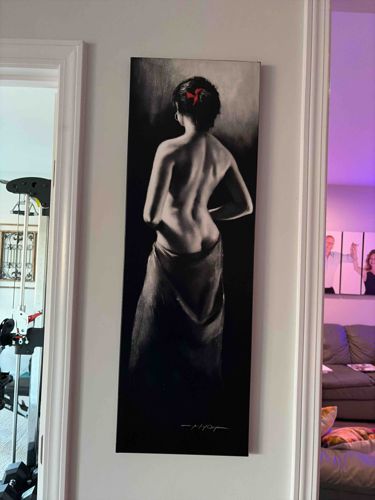 This item is an elongated, vertically oriented art print or canvas reproduction featuring a monochromatic depiction of a woman's bare back, seen from behind. The primary colors are shades of black, white, and grey, creating a dramatic contrast. The woman’s skin tone is rendered in lighter greys and whites, highlighting the musculature and curves of her back, particularly her shoulders, spine, and lower back indentations. Her hair, which appears to be dark and styled in a short bob or similar fashion, is accented with a vibrant red ribbon or bow centrally placed, providing the only significant splash of color in an otherwise grayscale image. A draped fabric, possibly a towel or cloth, covers her lower body from the mid-buttocks downwards, rendered in slightly darker grey tones with visible folds and wrinkles suggesting texture. The background is predominantly dark, almost black, with some subtle lighter grey or white brushstrokes or textures visible at the top, implying a dimly lit or abstract setting. At the bottom right corner of the print, a legible signature in white script is present, which reads 'J M Philippa' or similar, suggesting the artist or a reproduction signature. The item appears to be mounted on a stretcher bar frame, indicative of a canvas print, rather than a framed paper print behind glass, given its flat appearance against the wall. The surface appears matte or semi-matte, without significant reflections, and the overall condition seems very good, with no visible damage, fading, or wear from the provided image. The style is realistic and expressive, focusing on human form and sensuality. The dimensions are tall and narrow, creating an elegant vertical line on the wall.