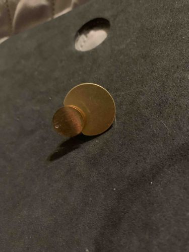 This item is a contemporary stud earring featuring a minimalist geometric design. It consists of two overlapping flat circular discs of unequal diameter, crafted from a yellow-toned metal, likely brass or gold-plated base metal. The larger back disc provides a backdrop for the smaller foreground disc, creating a tiered architectural look. The metal surfaces exhibit a brushed or satin finish rather than a high-polish shine, which helps hide fingerprints but shows fine directional scratches consistent with manufacturing or wear. The color is a consistent warm gold-tone across both elements. Regarding condition, the piece shows minor surface abrasions and a small dark speck on the smaller circle, which may be a pit in the plating or surface oxidation. There are no visible maker's marks, hallmarks, or karat stamps on the front surfaces. The style is late 20th-century to contemporary modernism, characterized by clean lines and an absence of ornamentation. The craftsmanship appears to be of commercial quality, with clear edges and a secure attachment between the two discs. It is displayed against a dark, textured gray background, possibly a jewelry display card or felt tray.