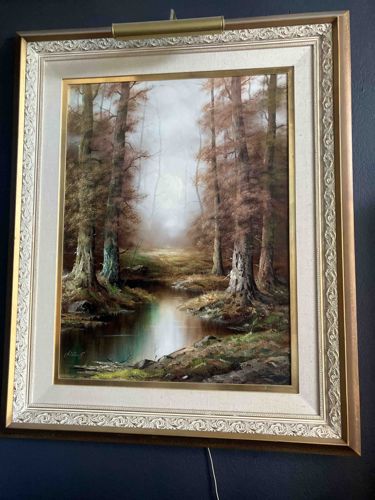 This is a large-format landscape oil painting on canvas, depicting a tranquil, hazy forest scene at dawn or dusk. The composition features a central stream or pond reflecting the cool light of a misty sky, flanked by towering deciduous trees with copper-toned autumnal foliage. The artist has utilized a soft, atmospheric sfumato technique in the background to create depth and a sense of morning fog, while employing more textured brushwork in the foreground to define the rocky banks and mossy earth. The color palette is dominated by earthy browns, muted oranges, and deep forest greens, contrasted by the bright, luminous reflection in the water. The artwork is housed in a substantial, ornate multi-layered frame consisting of a gold-gilded outer edge, a wide off-white linen or fabric liner, and an inner scroll-work decorative border in a metallic silver or antiqued gold finish. A signature, which appears to be 'M. Weber' or similar, is visible in the lower-left corner. The piece is equipped with a functional brass-finish gallery picture light mounted to the top of the frame. The overall condition appears excellent with no visible craquelure, paint loss, or sagging to the canvas. The framing style and subject matter are characteristic of mid-to-late 20th-century decorative fine art, likely produced between 1970 and 1990. The craftsmanship shows a high degree of technical skill in light manipulation and perspective.