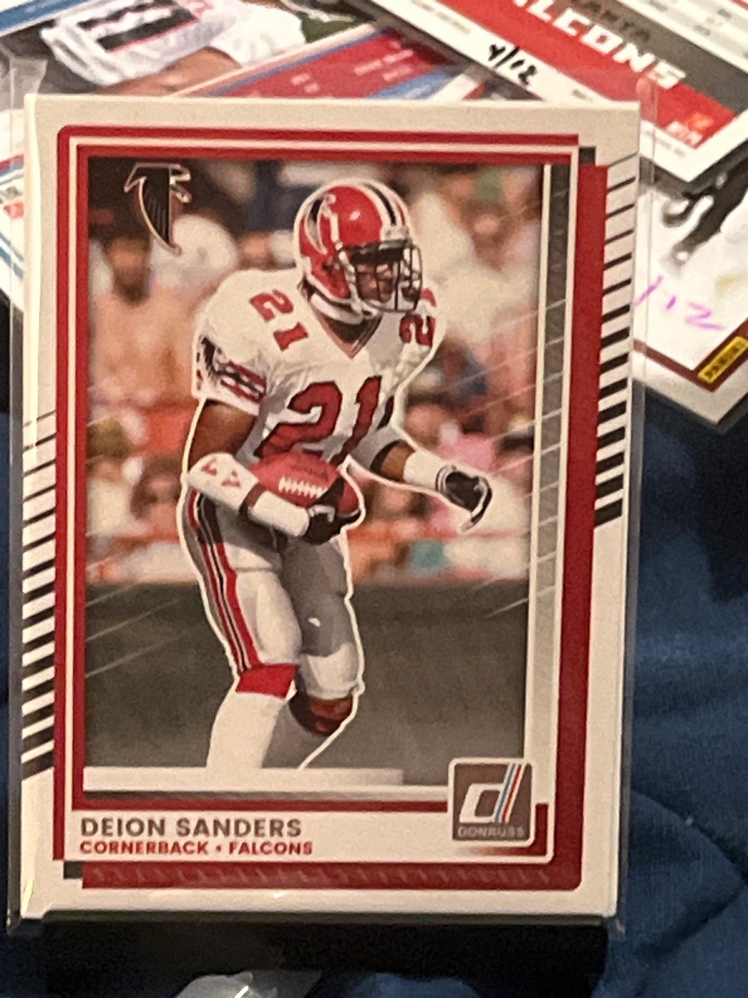 This is a modern sports trading card by Panini-Donruss featuring Hall of Fame cornerback Deion Sanders in his Atlanta Falcons uniform. The card measures approximately 2.5 by 3.5 inches and is constructed from heavy cardstock with a matte white border and a red-patterned interior frame. The design is a 'throwback' or 'retro' style, utilizing a high-action photograph of Sanders tucking a football, wearing his iconic red helmet and number 21 white jersey. The top left corner features the vintage Atlanta Falcons logo, while the bottom right corner displays the classic Donruss 'D' logo mark. The player's name and position are clearly printed in red and black sans-serif font along the bottom edge. In terms of condition, the card appears to be in Excellent to Near Mint state, housed in a thin protective soft sleeve ('penny sleeve'). The corners appear relatively sharp with minimal whitening, and the centering seems slightly weighted toward the bottom and right edges. There are no visible creases, surface scratches, or ink stains on the front plate. The color saturation is high, reflecting modern printing quality meant to mimic late 1980s or early 1990s aesthetics. The card is part of a contemporary Donruss set, likely released within the last five to ten years as part of an 'All-Time Gridiron Kings' or similar subset celebrating legendary retired players.