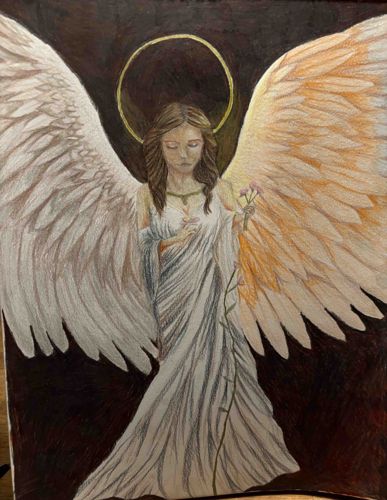 This original work of art depicts a feminine angelic figure with large, expansive wings and a glowing halo. The piece appears to be created using a mixed media approach on a textured surface, likely heavy paper or illustration board, incorporating colored pencils, graphite, and metallic gold paint or leaf. The central figure is dressed in a flowing, pleated white Grecian-style gown with cold-shoulder sleeves, rendered with fine linear shading to create texture. She has long brown hair and closed eyes, holding small pink blossoms in her hands. The most striking features are the large wings; the left wing is rendered in cool white and grey tones, while the right wing is suffused with warm golden and orange highlights. A distinct, circle-shaped gold halo is positioned behind the head, standing out against a dark, moody background of deep browns and maroons. The background exhibits visible, expressive brushstrokes or hatching that provide a somber contrast to the bright central figure. The craftsmanship shows a high level of detail in the feathering of the wings and the delicate facial features. Condition appears excellent with no visible tears or fading, suggesting a contemporary or modern creation from the late 20th to early 21st century. The artwork lacks a visible signature on the front, indicating possible identification on the verso.