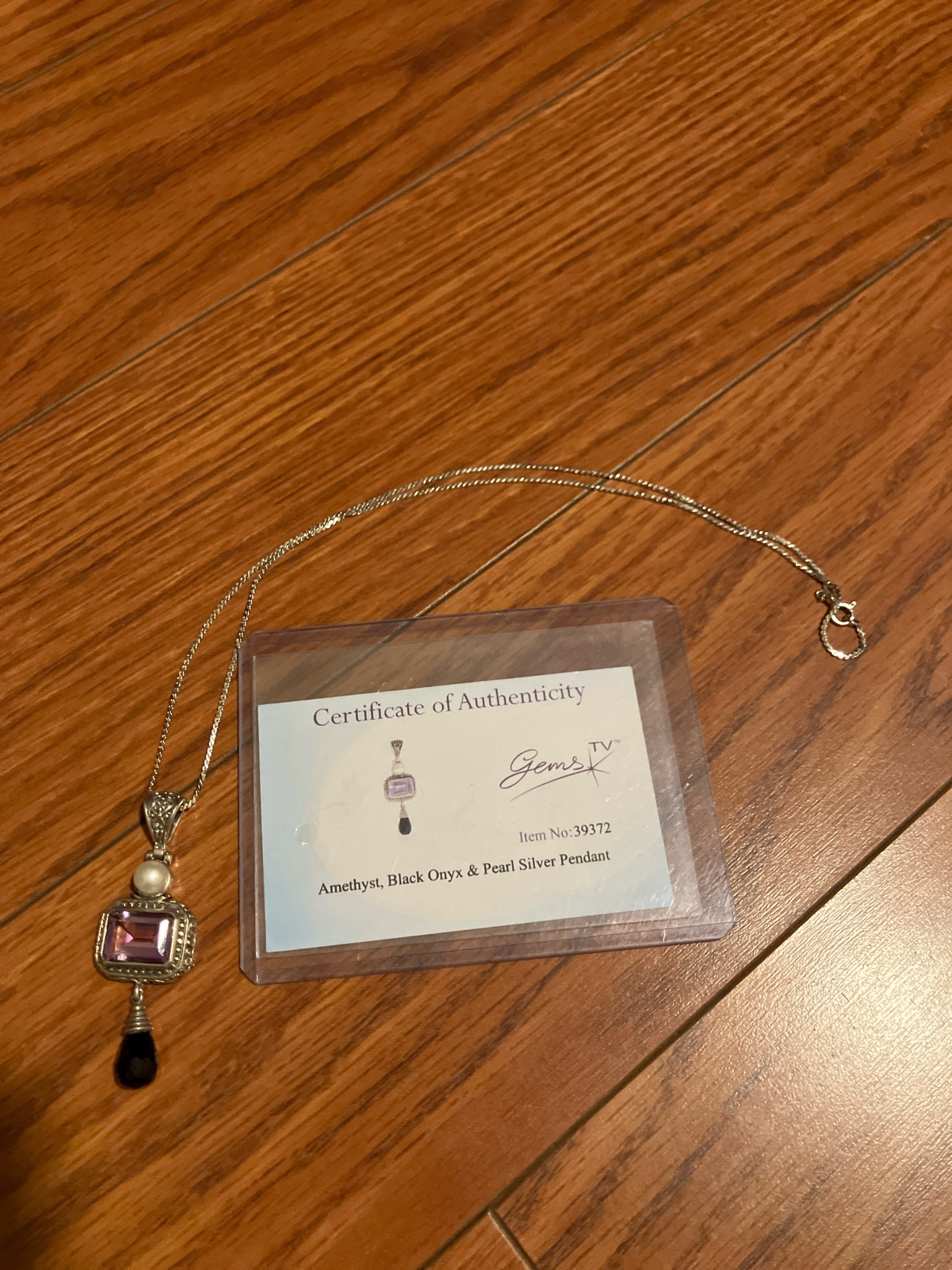 This is a decorative multi-stone pendant necklace featuring a central emerald-cut purple amethyst set in an ornate silver frame. The pendant is constructed with a vertical tiered design: at the top is a bail with intricate filigree or scrollwork, followed by a single white round cultured pearl. Below the pearl sits the primary amethyst gemstone, which is surrounded by a textured border featuring milgrain detailing and beaded accents. Suspending from the bottom of the amethyst setting is a faceted teardrop or briolette-cut black onyx drop, wrapped with silver wire at the top. The entire pendant is suspended from a delicate silver-tone rope or box chain with a spring-ring clasp. Accompanying the piece is a Certificate of Authenticity from "Gems TV," identifying the item as number 39372. The craftsmanship reflects a contemporary vintage-inspired style. The silver components show a slight patina consistent with light use, while the gemstones appear well-set with no visible chips or fractures. The overall condition is excellent, suggesting modern manufacture likely from the late 20th or early 21st century.