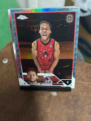 This is a modern sports trading card featuring basketball player Jahzare Jackson of the City Reapers team within the Overtime Elite (OTE) league. The card is produced by Topps under the 'Chrome' brand and features a refractor or holofoil border that multi-colors light when tilted. The layout includes 'Topps Chrome' branding on the top left and the OTE logo on the top right. Jackson is depicted in his red and black City Reapers jersey in a celebratory pose. A smaller portrait and the team logo appear at the bottom alongside his name. The card appears to be standard size (2.5 by 3.5 inches) with a glossy finish and a metallic-like cardstock construction. Regarding condition, the card is shown out of a protective sleeve, resting in a stand. The centering appears slightly heavy toward the right border. The corners show some minor soft edges visible at the top left, though no major creases or surface scratches are immediately apparent from the photo. This item belongs to the 2023-2024 production cycle, reflecting the boom in alternative basketball league collectibles. The craftsmanship is typical of high-end Topps Chrome products, utilizing UV-coated chrome technology which provides a premium weight and shine compared to standard paper cards.