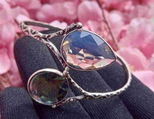 This is a contemporary-style open-cuff or bypass bangle bracelet featuring a dual-stone design. The metal construction appears to be a silver-tone alloy with a distinctive hammered or textured finish, creating an artisanal, bohemian aesthetic. The larger stones are likely faceted glass or synthetic crystal, possibly with an aurora borealis (AB) or dichroic coating that reflects a range of lavender, pink, and smoky blue hues. One stone is a large pear or teardrop-shaped cut, while the secondary stone is a round brilliant cut with iridescent green and bronze flashes. The stones are secured in bezel settings adorned with small granulation or 'bead' accents at the terminals. The band exhibits a wavy, organic silhouette with stamped patterns that simulate a vine or hand-wrought texture. No visible maker's marks are present in the image, suggesting a boutique or handcrafted origin. The condition shows light oxidation or patina in the recessed areas of the metalwork, which is often an intentional design choice to highlight the texture. The craftsmanship indicates a mid-market fashion jewelry piece, likely produced in the late 20th or early 21st century.