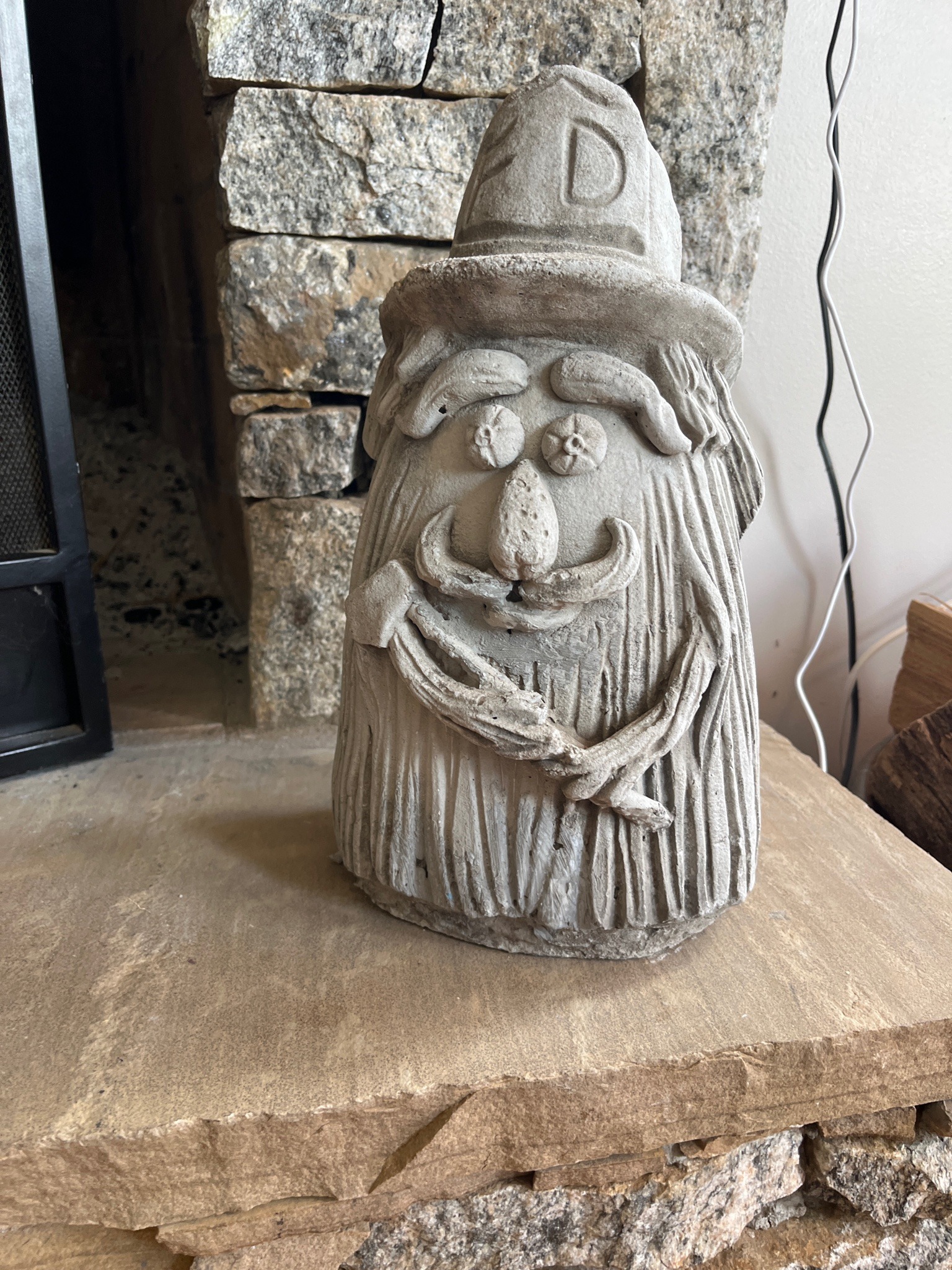 This is a whimsical folk art sculpture of a fireman, likely crafted from cast stone or a heavily textured concrete medium. The figure stands approximately 12 to 14 inches tall and features a grayish-beige natural stone color with a porous, grainy surface texture throughout. The design is highly stylized and rustic, characterized by a large, bell-shaped body that transitions directly into a face without an anatomical neck. The character wears a traditional fire helmet marked with a prominent letter 'D' on the front shield. It features oversized, bushy eyebrows, circular eyes with impressed cross motifs, a bulbous nose, and a curved mustache. Long, vertical incised lines represent a floor-length beard or coat. The figure is shown holding a small hand-axe diagonally across its midsection. The construction suggests a hand-finished casting process, common in mid-to-late 20th-century garden ornaments. The condition appears stable with no major cracks or structural losses, though it exhibits a natural weathered patina, surface pitting, and minor abrasions consistent with outdoor display or storage on a stone hearth. The lack of visible maker's marks suggests a small-batch artisan or craft production rather than industrial manufacture.