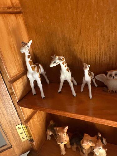 This item consists of a set of three graduated animal figurines depicting giraffes, likely manufactured and hand-painted in Japan during the mid-20th century (circa 1950s-1970s). The figures are crafted from fine bone china or porcelain with a glossy glaze finish. Each giraffe features a white base color decorated with caramel-brown patches and hand-painted black detailing for the eyes and facial features. The set includes a large, medium, and small figure, common in collectible 'family' sets of the era. The largest giraffe stands in a classic upright pose, while the middle figure is depicted with a lowered head, and the smallest represents a calf. Physically, they exhibit slim legs and stylized necks characteristic of porcelain miniatures. Condition-wise, the pieces appear well-preserved under glass, though high-glaze ceramics of this age often show fine surface crazing or minor glaze wear on the base. No visible chips or repairs are noted in the photograph. While specific 'Made in Japan' foil stickers are not visible, the style, material, and posing are highly indicative of export wares from that region and period. The craftsmanship is delicate, featuring thin walls and precise paint application for the spots.