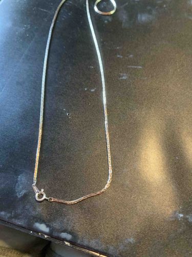 This item is a slender, silver-tone chain necklace, measuring approximately 16 to 18 inches in length, characteristic of a classic pendant-style chain. The piece is constructed using a refined box link (Venetian) style, where square-shaped metal links are interconnected to create a smooth, continuous geometric aesthetic. The material appears to be either sterling silver or a high-quality silver-plated base metal, exhibiting a bright, reflective metallic finish. A notable feature is the secure spring ring clasp mechanism, which includes a standard circular loop for closure. There is a slight kinking or minor structural deformation visible near the clasp end, suggesting the chain may have been caught or lightly stressed. No overt manufacturer's hallmarks or purity stamps (such as '925') are clearly legible in the current view, though they would typically be located on the small jump rings or the clasp itself. The overall craftsmanship is uniform and consistent with contemporary jewelry manufacturing. Its minimalist design suggests it is a versatile accessory, likely dating from the late 20th century to the present day, intended for everyday wear either alone or paired with a lightweight charm.