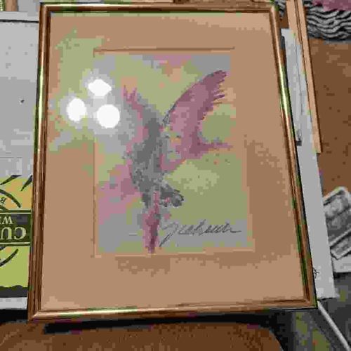 This item is a framed original watercolor or high-quality mixed-media work of art depicting a bird in flight. The composition features fluid, impressionistic brushstrokes with a color palette dominated by earthy ochre, soft pinks, and muted greys, set against a pale yellowish-green background. The bird is rendered with an emphasis on dynamic movement rather than anatomical precision. Notably, a large black cursive signature is visible in the lower-right quadrant, which appears to read 'Joshua.' The artwork is professionally matted with a thick, tan-colored mat board that provides a deep border. It is housed in a contemporary, thin-profile metallic gold-finished frame. The glass shows significant glare from overhead lighting, suggesting a standard reflective glass rather than museum-grade non-reflective coating. Physically, the piece appears to be in fair condition, though the low-resolution image shows some pixelation; however, the framing assembly seems intact without obvious chipping. The style is reminiscent of late 20th-century decorative art. The overall craftsmanship suggests a commercial art studio or a local artist's production aimed at interior decor.