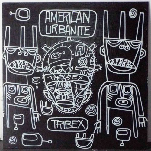 This is an original mixed media painting on a square panel, executed in a distinct Neo-Expressionist style heavily influenced by the work of Jean-Michel Basquiat. The artwork features a high-contrast monochromatic palette consisting of bold white line-work set against a flat, textured black background. The composition is centered around a complex, anthropomorphic mask-like form inscribed with the words 'AFROTEC' and 'TRIBEX.' To the left and right are two large, stylized skeletal figures with crown-like protrusions or three-pronged hair, gritted teeth, and wide, empty eyes. The piece is rich with textual elements and industrial-tribal imagery, including the phrases 'AMERICAN URBANITE' and 'TRIBEX' housed within rounded rectangular frames similar to street art tags. The execution shows various line weights, suggesting the use of paint markers or various brush sizes over a prepared black surface that reveals a slight wood grain or canvas texture. The condition appears stable with minor edge wear consistent with handling an unframed panel. There are no visible artist signatures on the face of the work, though the style strongly suggests a contemporary artist working in the late 20th or early 21st century urban art tradition. The craftsmanship is characterized by intentional raw energy, rapid-fire imagery, and a synthesis of street art aesthetics with traditional fine art media.