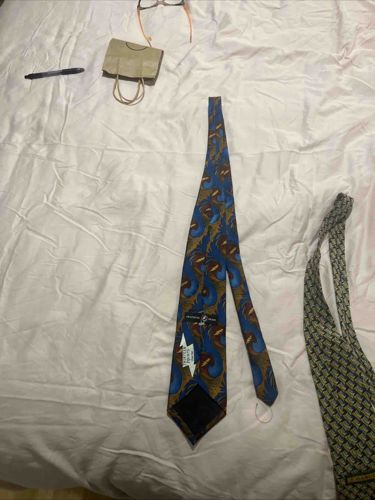 This is a vintage men's necktie from the 'J. Garcia' collection, specifically designed featuring the artwork of Grateful Dead frontman Jerry Garcia. This piece is constructed from 100% silk and features a vibrant, abstract psychedelic pattern. The color palette is dominated by cerulean blue, golden brown, and deep ochre, arranged in fluid, swirling organic shapes reminiscent of his 'Art in Motion' series. The tie is of a standard width, likely 3.5 to 4 inches at the widest point, suggesting a production date in the late 1990s or early 2000s. A key identifying feature is the 'Garcia' signature label and the distinctive white lightning bolt tag on the reverse tipping, which are hallmark branding elements for this line. The condition appears fair to good; while the silk retains its sheen, there is visible fraying and loose threading at the very tip of the narrow end (the tail), which may require minor restoration to prevent further unraveling. The main body of the tie seems free of significant staining or snagging in the visible areas. The craftsmanship includes a dark contrasting tipping on the reverse and a loop for the tail, common in mid-range designer neckwear.