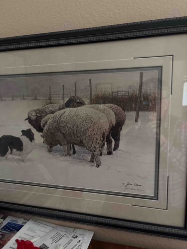 Framed Limited Edition Print of Sheep and Border Collie in Snow by John Weiss