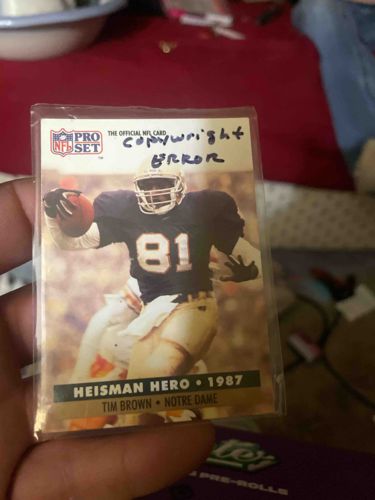 This is a 1990 Pro Set football card featuring wide receiver Tim Brown during his college career at Notre Dame, part of the 'Heisman Hero' subset. The card measures approximately 2.5 by 3.5 inches and is constructed from standard medium-weight cardstock with a semi-gloss finish. The front features a full-bleed action photograph of Brown in a dark blue and gold Notre Dame jersey with the number 81. Notable markings include the 'NFL Pro Set' official logo in the top left and a gold/green banner at the bottom identifying him as the 1987 Heisman Hero. The card is currently housed in a clear plastic soft sleeve. Significant condition issues are present: there is heavy black ink handwriting across the top white margin that reads 'COPYWRIGHT ERROR' in a non-professional hand. While 1990 Pro Set is known for numerous printing variations, this specific ink marking is aftermarket graffiti rather than a factory error, which severely impacts the card's collectible value and grading potential. The edges show slight silvering and soft corners, typical for mass-produced cards of the early 1990s 'junk wax' era.