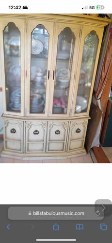 This is a substantial vintage two-piece china hutch or breakfront cabinet, designed in a French Provencal or Mediterranean Revival style popular in the mid-to-late 20th century (c. 1960s-1970s). The top section features four tall arched glass-paned doors with wooden mullions, housing multiple interior shelves for display. The lower base contains four cupboard doors with molded raised panels and decorative antiqued metal pull handles. The piece is finished in a light 'antique white' or cream-colored paint with intentional dark distressing (glazing) in the crevices to simulate age. The construction appears to be a mix of solid wood and veneers, common for high-production furniture of that era. Notable features include the chamfered corners on both the hutch and base, giving it a faceted appearance. The condition appears fair to good for its age; there is visible wear to the painted finish, particularly along the base moldings and door edges, and the glazing has darkened over time. There are no immediate signs of broken glass, though the hardware shows a heavy patina consistent with the style. This type of furniture was frequently produced by American manufacturers like Drexel, Ethan Allen, or Thomasville, though no maker's mark is visible in the provided image.