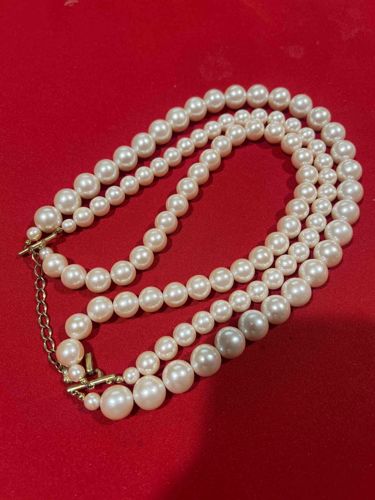 This is a vintage-style three-strand necklace featuring graduated simulated pearls in a creamy white or off-white hue. The necklace is constructed with three distinct strands that increase in length to create a layered, tiered effect when worn. Each strand features pearls that appear to be made of glass or plastic with a pearlescent coating, graduated in size with the largest pearls positioned at the center front and smaller pearls near the clasp. The assembly is secured by gold-tone metal hardware including bar spacers that keep the three strands aligned. It features a gold-tone extension chain (extender) with a lobster claw or hook-style fastening, allowing for adjustable length. The luster appears consistent, though there are visible signs of wear including some surface scuffing and potential thinning of the nacre-mimic coating on specific beads. The hardware shows a slightly brassy patina indicative of age and usage. Based on the construction and findings, this piece likely dates from the mid-to-late 20th century and serves as a classic example of costume jewelry designed to emulate high-end cultured pearl jewelry.