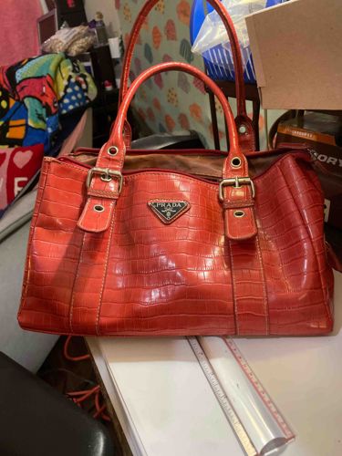 This is a medium-sized tote-style handbag featuring a vibrant orange exterior with a prominent faux-crocodile or alligator embossed texture. The bag is constructed with dual-rolled leather top handles and features chrome-toned hardware, including decorative buckles where the handles meet the bag's body. A central, triangular enamel 'PRADA MILANO' logo placaue is positioned on the front face. The stitching is executed in a contrasting light-colored thread, tracing the vertical straps and the top border. Several condition issues are immediately apparent, suggesting this may be a replica or fashion-grade item rather than authentic luxury goods: there is significant creasing and warping of the material on the front face, visible wear and discoloration along the piping of the handles, and the overall rigidity and sheen of the material suggest a synthetic or heavily treated leather. The interior lining appears to be a brown fabric with some visible staining or debris. The craftsmanship lacks the precision typically seen in high-end luxury goods, with uneven tension in some of the decorative stitching and hardware that appears somewhat lightweight.