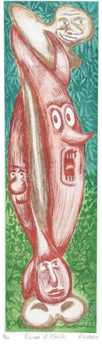 This is a vertical limited edition original print executed using a combination of intaglio techniques, specifically color etching and aquatint (eau-forte). The artwork features a surreal, elongated central form rendered in reddish-brown and pink tones, which appears to be a stylized anatomical muscle fiber undergoing a metamorphosis. Various anthropomorphic faces with expressive features—including wide eyes and an open, shouting mouth—are integrated into the organic, fleshy shapes. The central figure is set against a vibrant green background composed of dense, leafy patterns reminiscent of foliage. The piece is signed in pencil by the artist, 'H. Walker,' at the bottom right and titled 'Fission of Muscle' in the lower center. To the far left, it is marked with an edition number, though the exact ratio is partially obscured. The construction demonstrates high-level printmaking skill, characterized by the fine-lined hatchings of the etching process and the soft, tonal gradations typical of aquatint. The color palette is dominated by contrasting warm red-earth tones and cool emerald greens. The condition appears consistent with a well-preserved contemporary fine art print on heavy-weight white paper, though minor softening of the paper edges is visible. The style suggests a late 20th-century origins, blending elements of biomorphic surrealism with graphic illustration techniques.