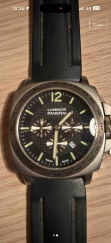 This is a Panerai Luminor Chrono Daylight, a distinctive luxury wristwatch known for its robust cushion-shaped case and signature crown protection bridge. The timepiece features a brushed stainless steel or titanium case approximately 44mm in size, characteristic of the brand's bold aesthetic. It showcases a black dial with a textured hobnail (Paris de Clous) pattern, accompanied by three chronograph sub-dials situated at the 3, 6, and 9 o'clock positions. A date window is tucked between 4 and 5 o'clock. The dial is marked with luminous hour indices and an oversized Arabic numeral for 12, flanked by the 'Luminor Panerai' branding. The fixed bezel includes an engraved tachymeter scale for speed calculations. It is paired with a black rubber sporting strap, indicating a utility or dive-style configuration. Visible condition markers include light surface scuffing on the bezel and case edges consistent with regular wear. The crystal appears clear, though minor lint is present on the surface. Historically, this model series gained fame from its association with the movie 'Daylight,' typically dating from the early-to-mid 2000s in this specific configuration. The craftsmanship is evidenced by the precise engraving on the tachymeter and the alignment of the crown guard lever.