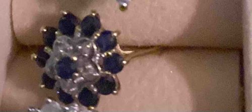 This is a yellow gold cluster ring featuring a floral or snowflake motif. The central setting consists of a primary cluster of clear stones, likely small round-cut diamonds, arranged in a tight circular formation. This center is surrounded by an outer halo of ten round-cut stones that display a deep, dark navy blue hue characteristic of sapphires. The metal appears to be yellow gold, visible in the delicate prong work holding each individual stone and the thin, polished gold band tapering toward the setting. The construction uses a multi-tier basket setting to elevate the gemstones, providing depth to the floral design. Based on the aesthetic, this piece likely dates from the late 20th century (circa 1980s-1990s), a period when tiered cluster rings were particularly popular. The stones are 'shared-prong' or individually prong-set, showing traditional jewelry craftsmanship. While the image is slightly out of focus, the stones appear to be intact with no major visible chips or missing elements, though there may be minor surface scratches on the facets and light characteristic wear on the gold band consistent with age. This style is often referred to as a 'Princess Diane' inspired cluster, though in a more circular geometry.