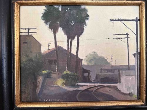 This item is an original oil painting on what appears to be a canvas or panel support, measuring approximately 8x10 to 11x14 inches. The composition features an urban landscape depicting a curved track or driveway leading into a residential or industrial area, flanked by two prominent palm trees and utility poles. The palette is muted with earthy tones of ochre, sage green, and hazy purples, characteristic of plein air California Impressionism. The brushwork is gestural but controlled, showing confidence in form and light. A clear signature 'S. Serrano' is visible in the lower left corner in a light pigment. The painting is housed in a contemporary, high-quality wooden frame with a gold-leaf inner liner and a wide black ebony-style outer molding. The condition of the artwork appears excellent with no visible craquelure, paint loss, or yellowing of the varnish. The frame shows minor surface dust but no significant chips or structural damage. Based on the style and framing, the piece likely dates from the late 20th to early 21st century and exemplifies professional-level craftsmanship common in west coast regional art galleries.
