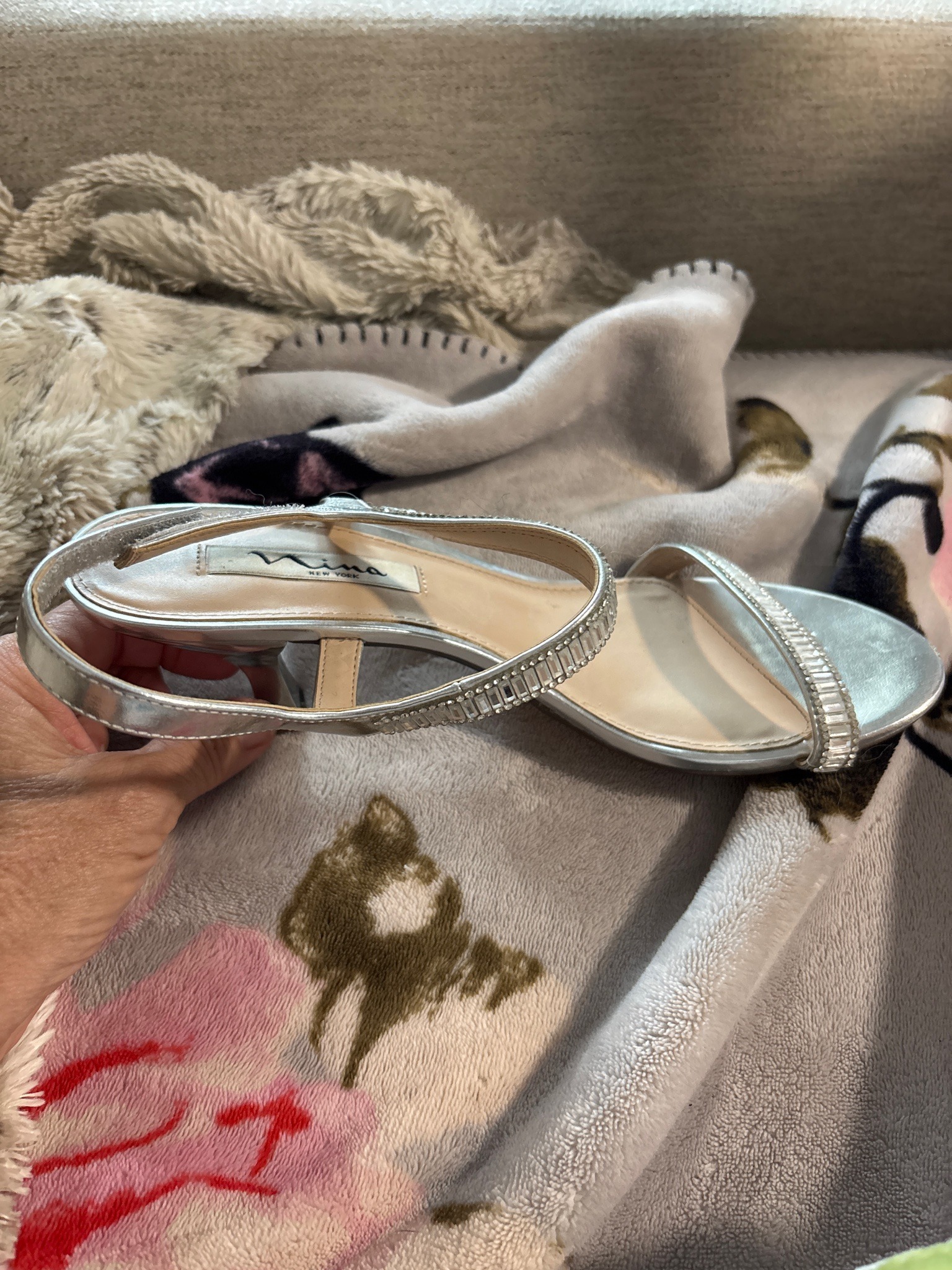 This is a single metallic silver evening sandal from the brand 'Nina New York.' The shoe features an elegant slingback design with several narrow straps. The primary construction consists of a synthetic or leather upper with a metallic silver finish. A defining feature is the decorative embellishment of graduated, rectangular clear crystals or rhinestones channel-set into the vamp strap and the diagonal instep strap, providing a high-glamor aesthetic typical of formal wear. The interior footbed is a light cream or beige color, featuring a sewn-in fabric label with the 'Nina New York' logo in black script. The shoe has a low profile, likely a kitten-style heel, which offers moderate elevation suitable for evening events or weddings. Visible condition shows minor signs of wear consistent with light use: there is some slight discoloration appearing at the toe bed area and around the heel edges. The overall construction displays typical mid-range fashion footwear quality, with clean stitching and securely fastened stones. The style is contemporary, likely manufactured within the last 5 to 10 years, and it maintains a timeless formal appearance without significant structural damage like broken straps or missing jewels.