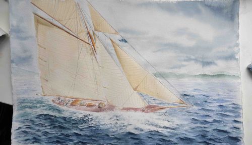 Brand new watercolour painting of a J-class yacht. 55 x 33 cm.