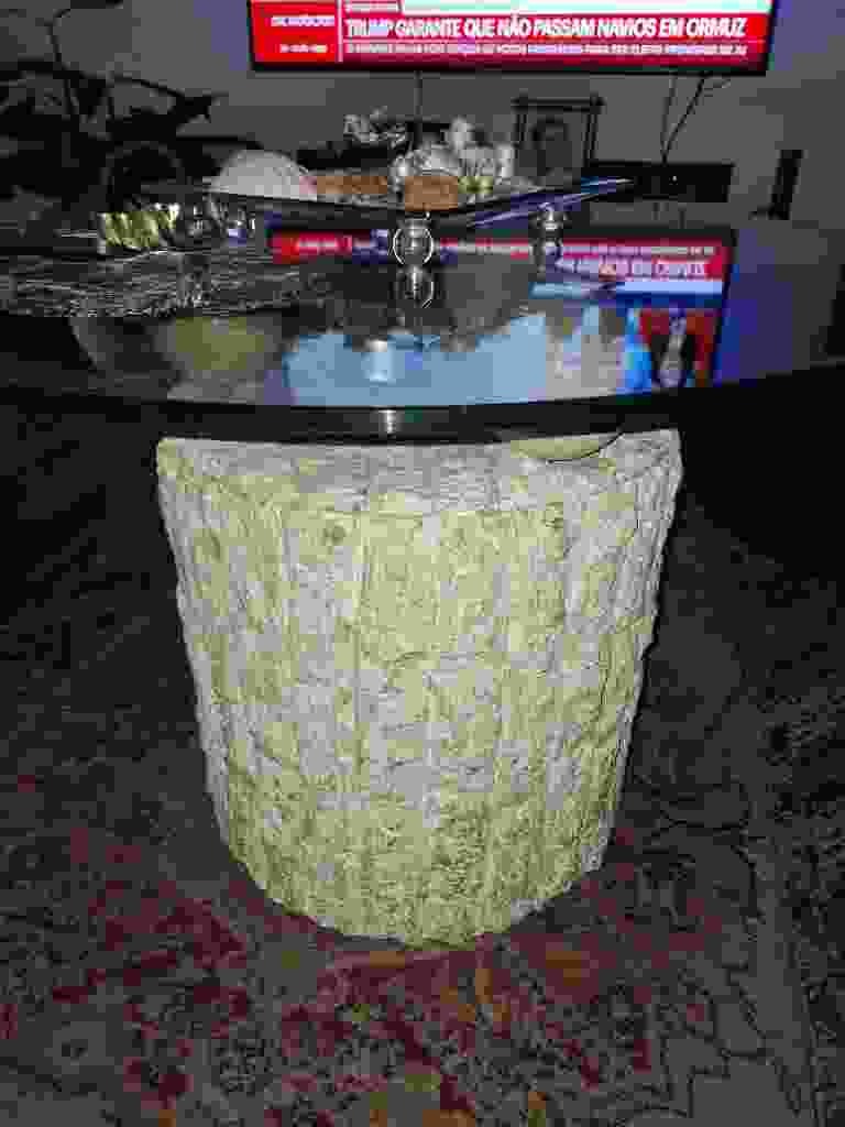 This is a postmodern-style coffee table featuring a heavy, cylindrical pedestal base and a thick glass top. The base is constructed from what appears to be concrete or a cast composite material, designed to emulate the texture of chiseled stone or hand-cut masonry blocks. Its aesthetic is characterized by a rough-hewn, brutalist finish with vertical and horizontal crevices, colored in a monochromatic off-white or light beige tone with a notable yellowish patina that may be due to age or original pigmenting. The base provides a sturdy, structural contrast to the minimalist and transparent glass top. The glass panel is circular or oval, featuring a polished edge and substantial thickness, indicative of high-quality construction meant to bear weight safely. There are no visible maker's marks or signatures in the photograph, but the style is reminiscent of 1970s or 1980s architectural furniture. Condition-wise, the base shows some surface discoloration and potential minor chipping consistent with cast stone materials of this age. The glass appears intact without large visible scratches or fractures, though fine surface wear would be typical. The overall craftsmanship suggests a designer influence, aiming for a 'naturalistic yet industrial' interior design statement.