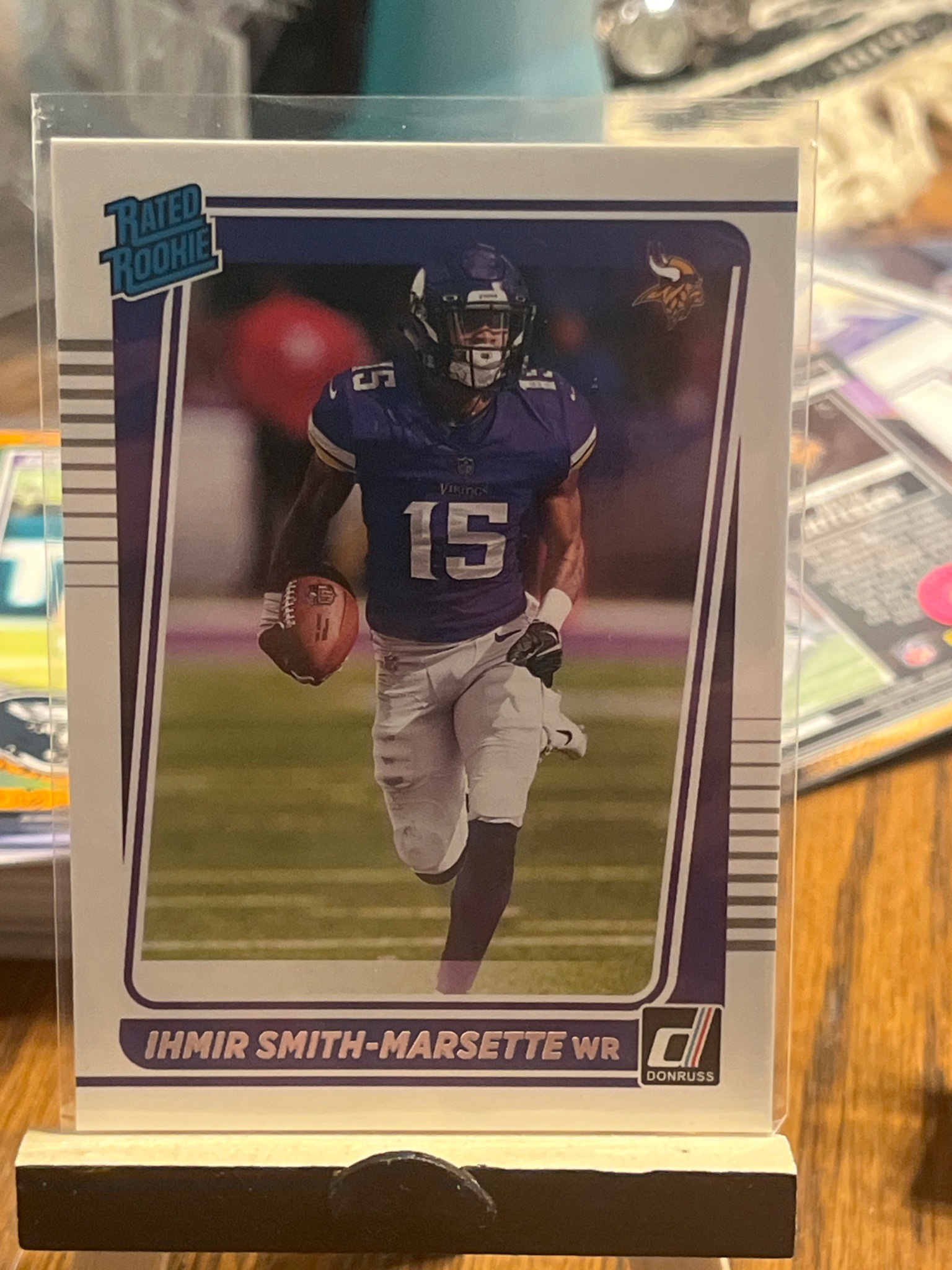 This is a 2021 Panini Donruss football trading card featuring Ihmir Smith-Marsette in his Minnesota Vikings home uniform. The card is a standard 2.5 by 3.5-inch trading card stock with a glossy finish. It prominently displays the iconic 'Rated Rookie' logo in the upper left corner within a teal blue box. The player is depicted in an action shot, carrying a football and wearing a purple jersey with the number 15. The design includes a thick white border with blue and purple pinstripe accents, and the Minnesota Vikings team logo is visible in the top right. At the bottom, a purple name plate displays 'IHMIR SMITH-MARSETTE WR' next to the Donruss 'D' logo. The card appears to be in excellent raw condition, sitting inside a clear protective soft sleeve (penny sleeve). The centering looks relatively balanced, with even white borders on the left and right sides. There are no visible surface scratches, corner blunting, or edge chipping apparent through the protective plastic. This card represents a modern 'base' rookie card from a highly popular flagship set, recognized for its long-standing history in the sports card hobby. The craftsmanship shows typical high-quality modern offset lithography printing with vibrant colors and sharp image resolution.