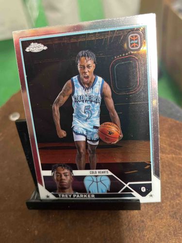 This is a modern collectible sports trading card featuring basketball player Trey Parker from the Overtime Elite (OTE) league, specifically representing the 'Cold Hearts' team. The card is part of the prestigious Topps Chrome series, characterized by its signature chromium finish and reflective surface. Physically, the card maintains the standard 2.5 by 3.5-inch dimensions on high-gauge cardstock with a metallic sheen. The design showcases a full-action shot of Parker in his blue and white 'Cold Hearts' jersey, holding a basketball against a dark gym background. Notable markings include the 'Topps Chrome' logo in the upper left, the 'OTE' logo in the upper right, and a secondary headshot of the player at the bottom next to his name and the team's heart-motif logo. The card's condition appears relatively good, though visible silver bordering shows slight light refraction consistent with the Chrome technology. There are no immediate signs of deep scratching or creasing in the image, but critical graders would look for micro-surface scratches and edge chipping, which are common with this high-gloss material. As a contemporary release from the 2023-24 season, it captures a rising prospect in the evolving professional-pathway basketball system, representing a high-quality manufacturing standard typical of Topps' chromium-plated product lines.