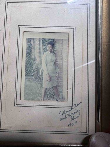This item is an original black and white or sepia-toned full-length portrait of a young African American woman, housed within an ornate multi-windowed mat and a metallic frame. The subject is depicted outdoors, leaning against a brick wall with ivy, wearing a light-colored, long-sleeved dress that aligns with mid-1960s fashion aesthetics. The photograph is professionally mounted behind a white mat featuring decorative black linework. A significant feature is the handwritten inscription in the lower-right corner of the matting, which reads, 'To Aunt Ann and Uncle Gus 1967'. The ink appears to be from a period ballpoint pen and remains legible despite age. The frame appears to be a brushed gold or bronze-toned metal or wood laminate, indicating mid-century utilitarian framing. Regarding condition, there is visible foxing and light staining on the mat boards, particularly near the signature and bottom edges. The photograph itself shows slight fading and loss of contrast, typical for 1960s silver gelatin prints. There are minor scratches on the glass surface and some accumulated dust within the frame's edges. This piece serves as a personal historical artifact of African American domestic life from the late 1960s.