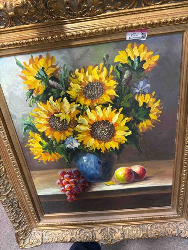 Floral Still Life with Sunflowers and Fruit signed by Kerrigan