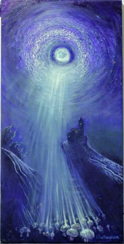 This original work is a vertical-format oil or acrylic painting on canvas, characterized by a surreal and celestial theme. The composition is dominated by a monochrome palette of deep violets, indigos, and glowing whites. At the top center, a bright celestial orb—resembling a full moon or mystical portal—is surrounded by a swirling, painterly vortex of clouds or energy. From this source, dramatic beams of light cascade downward in a divergent pattern, illuminating a group of round, mushroom-like forms or ethereal orbs at the base. To the right, a dark, silhouetted Gothic-style structure or small castle perches precariously atop a jagged cliffside. The painting style is expressive with visible, textured brushwork, particularly in the sky and the light rays. A clear signature reading 'Gallagher' is visible in the lower right corner. The canvas appears to be in good overall condition with no immediate signs of cracking or flaking, though there is a Slight softening of detail typical of contemporary amateur or semi-professional works. The piece reflects a late 20th-century to early 21st-century contemporary fantasy or visionary art style, showcasing a high contrast between dark shadows and brilliant white highlights to create a sense of mystery and depth.