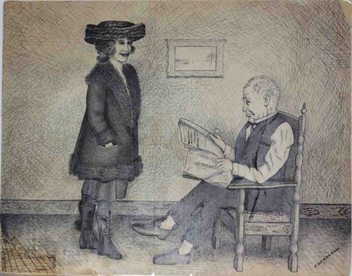 This is an original hand-drawn illustration executed in pen and ink on a paper or card substrate. The artwork depicts a domestic interior scene featuring two figures: a young woman standing in winter attire and an elderly man seated in a spindle-back armchair reading a newspaper. The woman is dressed in a fur-trimmed coat, a wide-brimmed hat, and lace-up boots, suggesting a style consistent with the early 20th century (circa 1910s-1920s). The man is depicted in profile, wearing a waistcoat and trousers. The background includes a framed picture on a cross-hatched wall and a patterned rug or floorboard detail. The artist has utilized a meticulous cross-hatching and stippling technique to create depth, shadow, and texture, particularly evident in the heavy shading of the woman's coat and the wall background. The paper exhibits noticeable signs of age and condition issues, including significant yellowing (toning), foxing, and visible staining, particularly in the lower-left corner where vertical and horizontal grid lines appear partially obscured by a water-like stain. There are also visible creases and softening of the paper edges. A signature or maker's mark is present in the lower right corner, though it remains partially illegible due to the angle and resolution. The overall craftsmanship suggests a skilled hand-rendered illustration from the early modernist or golden age of illustration era.