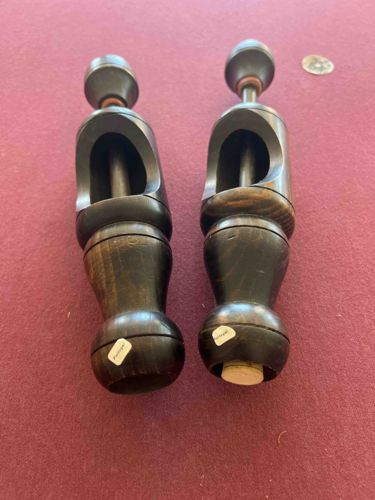 This is a pair of vintage turned wood tools specifically designed for cleaning or reaming tobacco pipes. Each tool is crafted from a dark-stained hardwood, possibly walnut or a similar dense grained wood, and features a multi-part turned construction with a bulbous handle and a rounded top finial. The central section of each device includes a significant semicircular cutout, housing a metal shaft mechanism that functions as the internal reaming element. The finish is a deep chocolate brown with a satin luster, showing various levels of age-appropriate wear including surface scuffs, minor dings, and slight wood grain separation typical of mid-20th-century wooden accessories. Small oval stickers are visible on one of the rounded bases, likely serving as price tags or inventory labels, though they do not appear to be original maker's labels. The craftsmanship suggests a commercial production from the 1940s to 1960s, a period when decorative and functional tobacco accessories were highly popular. The complexity of the turning and the integration of metal components indicate quality industrial woodworking. One unit appears more worn than the other, with visible lightening of the stain around the middle section. These objects stand approximately 6-8 inches tall and represent specialized utilitarian craftsmanship within the smoking memorabilia niche.