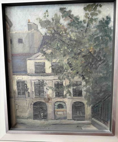 This is an original oil painting on canvas or board, depicting a charming European architectural street scene, likely set in France or Italy. The composition features a multi-story building with classic arched doorways and shuttered windows, partially obscured by a large, leafy tree on the right side. The color palette is dominantly muted, utilizing earthy tones of beige, cream, and grey for the stone facade, contrasted with deep greens and browns for the foliage. The brushwork is impressionistic and painterly, characterized by visible, textured impasto strokes that give the scene a sense of depth and atmosphere. A discernible signature is present in the lower right corner, which appears to read 'H.S. Greenman' or a similar phonetic equivalent, suggesting a mid-century artist. The work is housed in a contemporary silver-toned floater frame, which suggests a modern presentation of a vintage piece. The condition shows minor signs of age-appropriate surface dust and slight yellowing of the varnish, but no major cracks, paint loss, or repairs are immediately visible. The style suggests an execution period between 1940 and 1960, reflecting the post-impressionist interest in urban landscapes.