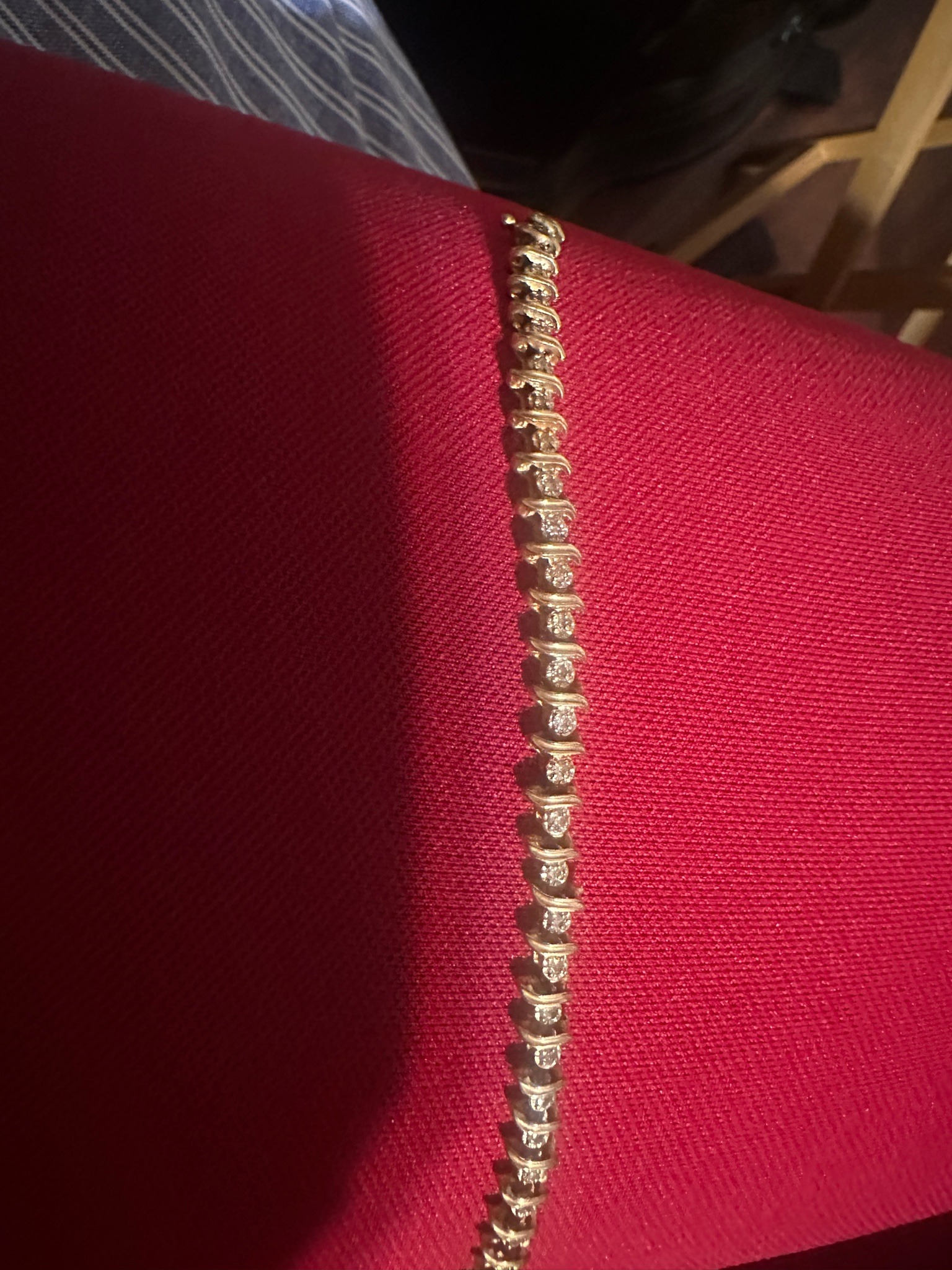 This is a classic tennis-style line bracelet featuring a series of articulated 'S-shape' or 'swirl' links crafted in yellow metal, likely 10k or 14k gold. Each link serves as a semi-bezel or prong setting for a small, round-cut colorless stone, which appears to be a natural or lab-grown diamond or possibly a high-quality stimulant such as cubic zirconia. The construction follows a repetitive pattern where the curved gold 'S' wraps around each individual stone, providing a fluid motion and a combination of polished metal luster and gemstone brilliance. In terms of condition, the piece shows light signs of surface wear and slight dulling of the stones, common with regular use, but no visible breakages in the links or missing stones are apparent from the provided photograph. The style is indicative of late 20th-century jewelry design, specifically popular from the 1980s through the early 2000s. The craftsmanship is commercial grade, designed for durability and everyday wear. A secure fold-over or box-and-tongue clasp is anticipated at the terminus, although it is not fully visible in this view. Without a direct view of hallmarks (like '14K' or a manufacturer's stamp), the exact metal purity remains unconfirmed, but the warm yellow hue is consistent with standard gold jewelry alloys.