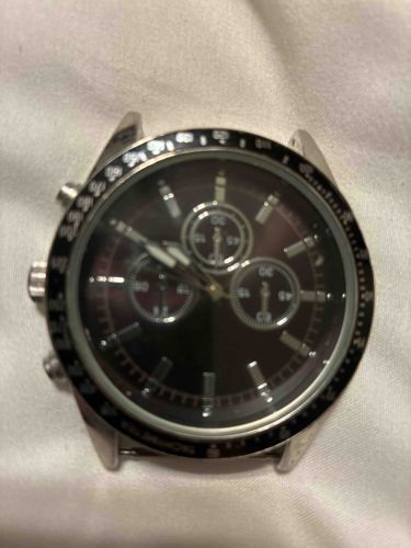 This item is a men's wristwatch head featuring a black multi-function dial housed in a silver-toned metal case, likely stainless steel or an alloy. The watch is presented without a band or strap. The design includes three sub-dials at the 6, 9, and 12 o'clock positions, mimicking a chronograph complication. It features baton-style hour markers and luminous sword-shaped hands. A fixed black tachymeter bezel surrounds the crystal. The case has two pushers and a central crown on the right side. The overall aesthetic suggests a modern sport-fashion style, inspired by higher-end racing chronographs. The finish shows minor micro-scratching on the polished lugs and case body, consistent with light previous wear. The crystal appears clear with no visible major cracks, though the image focus is soft. This appears to be a contemporary quartz-movement fashion watch rather than a luxury mechanical timepiece, as evidenced by the dial layout and finish quality. No specific brand logo is clearly legible in the current photograph.