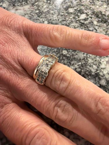 A contemporary style bridal set featuring a primary engagement ring nested against a matching wedding band, both crafted in polished yellow gold. The engagement ring showcases a prominent princess-cut center diamond, estimated at approximately 0.50 to 0.75 carats, flanked by two slightly smaller princess-cut diamonds to create a three-stone 'past, present, future' design. The shoulders of the engagement ring and the visible portion of the wedding band are channel-set with additional smaller princess-cut diamonds, creating a seamless wall of brilliance spanning the top of the finger. The construction is robust with wide, high-polished gold shanks that taper slightly toward the base. The diamonds appear to be of commercial quality with decent clarity, set securely within heavy gold walls. Notable condition observations include minor surface scratches and faint signs of wear on the gold polish consistent with daily use, though the structural integrity remains sound with no visible loose stones or damaged prongs. This style peak was during the early to mid-2000s, reflecting a preference for substantial metal weight and geometric stone cuts. The craftsmanship is professional, utilizing channel settings to protect the fragile corners of the square-cut diamonds.