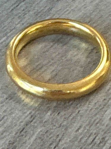 This item is a classic D-shape wedding band, characterized by its rounded exterior and flat interior profile. The ring is crafted from a bright, high-polish yellow metal, consistent with 18k or 22k yellow gold given its rich, saturated hue. The band appears to be approximately 3mm to 4mm in width with a substantial thickness, suggesting a solid construction rather than a hollow shell. The surface displays a reflective luster, although close inspection reveals a fine network of surface abrasions and micro-scratches consistent with regular wear and age. There are no immediate signs of resizing or major structural solder joints visible from this angle, indicating good integrity. The interior of the band is not fully visible, so specific hallmarks, fineness stamps, or maker’s marks cannot be definitively identified; however, the deep golden color is a strong indicator of high gold purity. The style is timeless and minimalist, likely dating from the mid-20th century to the contemporary era. The smooth, rounded edges exhibit quality hand-finishing or high-grade machine manufacturing, providing a comfortable fit for the wearer. There is a slight patina developing in the recessed areas where the ring meets the surface it is resting on.