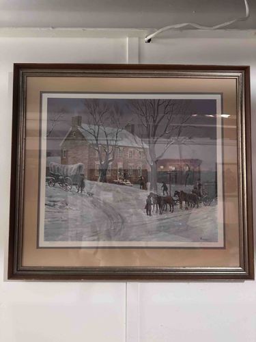 This item is a large-format, professionally framed offset lithograph or print by the American artist P. Buckley Moss. The scene depicts a colonial-style red brick building, likely an inn or tavern, set against a snow-covered winter landscape. The composition includes horse-drawn carriages, figures in traditional rural or Amish-style attire, and leafless, towering trees that frame the architecture. The color palette is dominated by muted earth tones, cool grays, and whites, capturing a twilight or overcast winter atmosphere. It is housed in a multi-layered presentation: an inner white border surround the art, a wide tan or khaki-colored mat, and a secondary dark border before meeting the frame. The frame reflects a mid-to-late 20th-century style, featuring a dark wood outer edge with an inner metallic silver or champagne-colored cove. In the lower-right corner of the print, the characteristic 'Moss' signature is visible, often accompanied by a handwritten edition number in pencil on authentic Moss prints. The condition of the frame appears good with minor scuffing along the wooden edges. The glass shows significant glare from overhead lighting, which suggests standard reflective glass rather than museum-grade anti-reflective glazing. The craftsmanship of the Matting appears well-executed, consistent with high-quality gallery framing from the 1980s or 1990s.